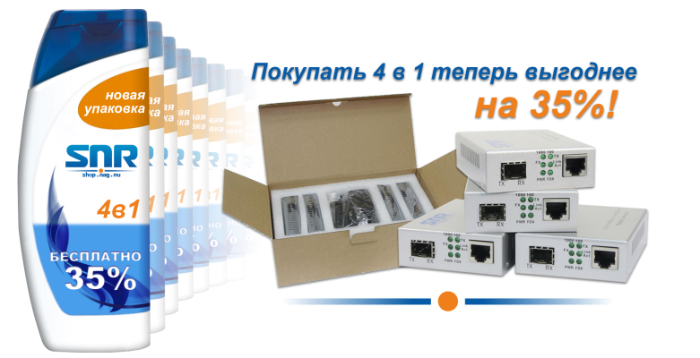 Приобретая медиаконвертеры 10/100/1000BASE-T / 1000BASE-FX в упаковке по 4шт. вы получаете ультранизкую цену! (скидка ~35% от стоимости SNR-CVT-1000SFP-V2).