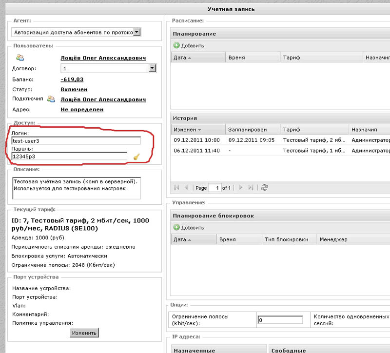 И уже в окне создания учётной записи выбираем типа агента для этой учётной записи – Radius, пишем login + passwd для авторизации, назначаем наш тариф со скоростями, и выделяем пользователю ip-адрес.