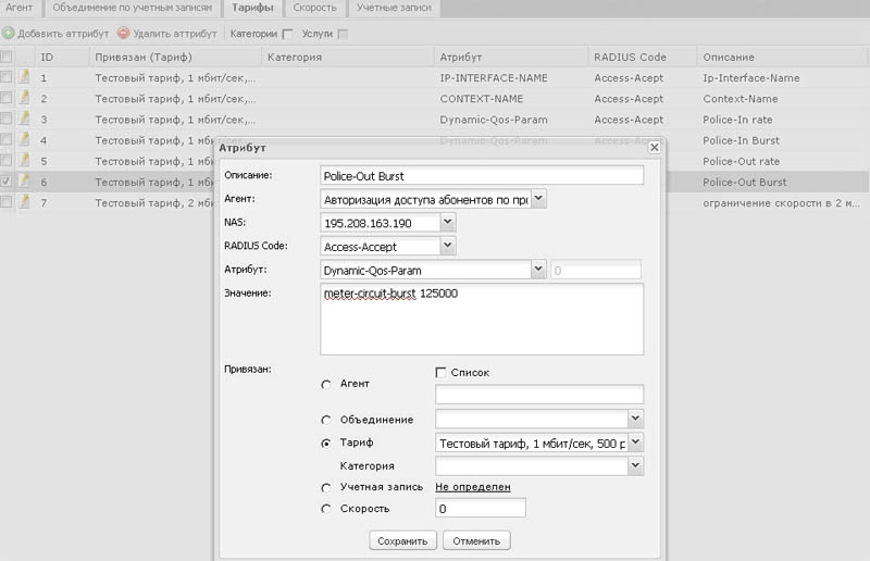 Заходим: «Свойства»-«Radius-атрибуты», выбираем вкладку «Тарифы». Нажимаем кнопку «Добавить атрибут».