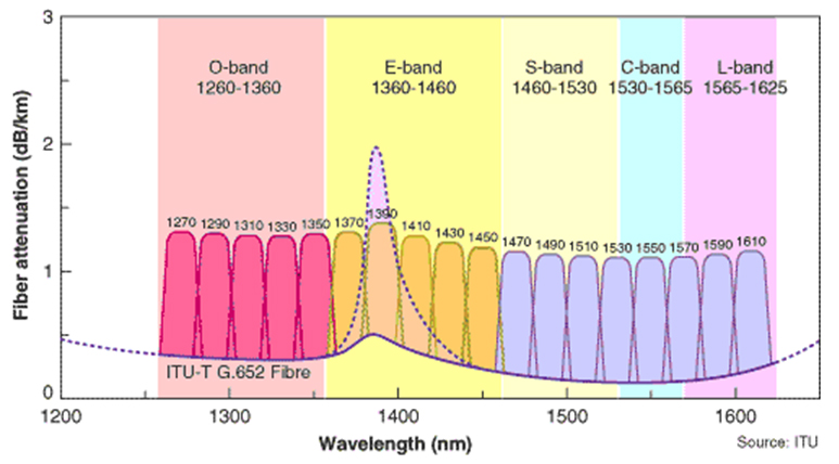 Как известно, затухание в оптическом волокне разное для разных несущих длин волн. Теоретическая зависимость для волокна G.652 выглядит примерно так:
