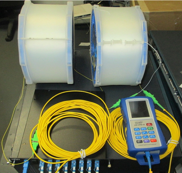 На фотографии: CWDM мультиплексор/демультиплексор, катушки с волокном, измеритель мощности CWDM.