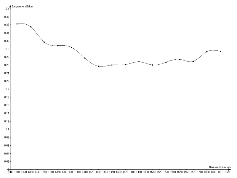 Значения затуханий получились несколько выше ожидаемых, форма графика в целом соответствует теоритической, но есть расхождения в контрольных точках. Объясняется это дополнительными разъемными соединениями, погрешностью измерительного прибора, а также тем, что оптическое волокно находится в смотанном виде.