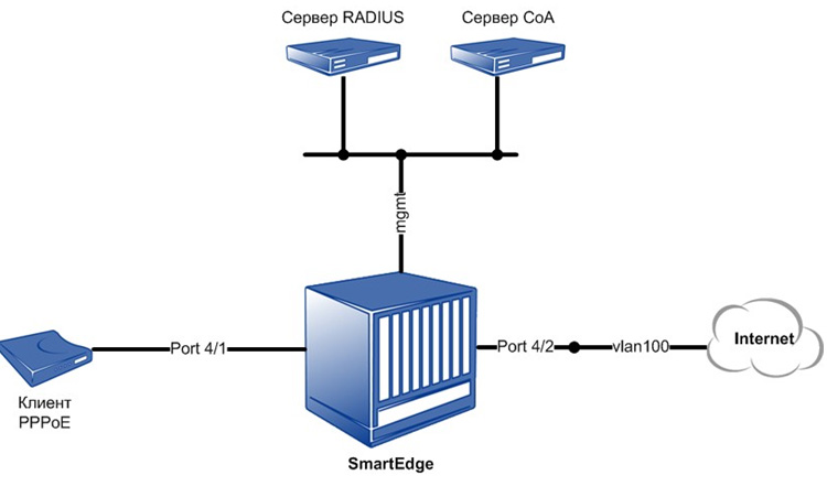 Следующий пример рассматривает конфигурацию, в которой SmartEdge терминируетPPPoE соединения с аутентификацией пользователей через RADIUS сервер. Схема тестового стенда: