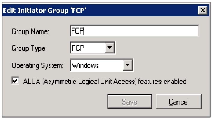 Внимание: Для добавления initiator ID для хоста, подключенного по протоколу Fibre Channel, выберите FCP из выпадающего списка Group Type и укажите соответствующий Host WWN в поле Initiator Name. Когда вы выбрали FCP,появится чекбокс включения ALUA. NetApp рекомендует включить ALUA. ALUA обеспечивает расширенный возможности выбора пути доступа для высокодоступных конфигураций.