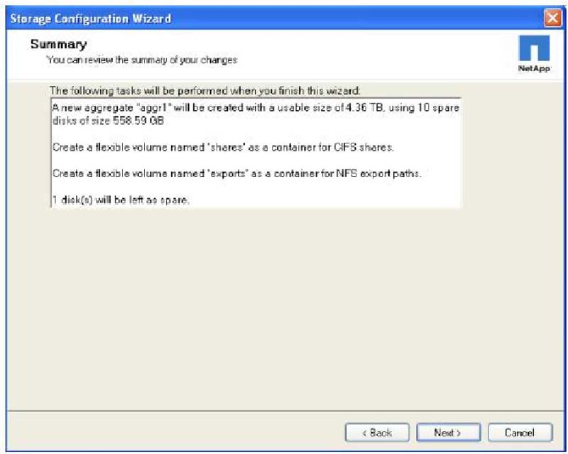 5. Проверьте итоговые установки после выполнения Storage Configuration Wizard и щелкните Next для создания aggregate.