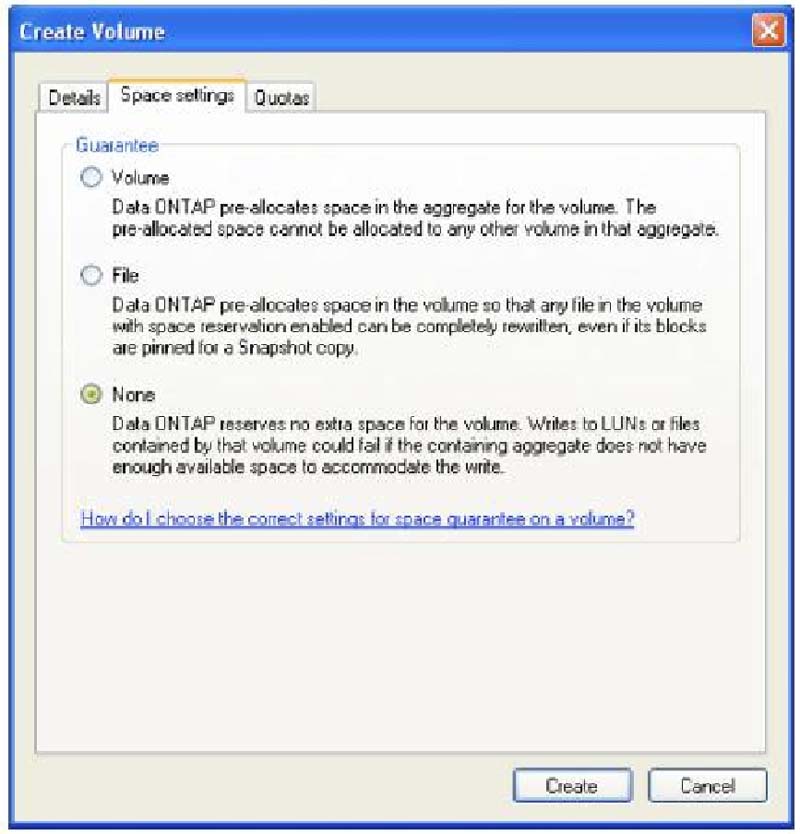 3. Закладка Space Settings используется для задания резервирования на диске пространства для тома. Вы можете зарезервировать пространство для всего тома, или для файла, используя задание свойств резервирования. Кроме этого, вы можете выбрать в качестве резервирования None, чтобы создать thinly provisioned volume который занимает место на дисках только по мере записи в него.