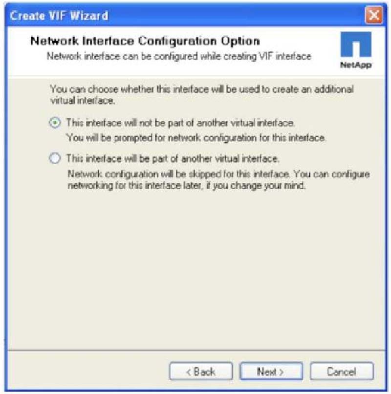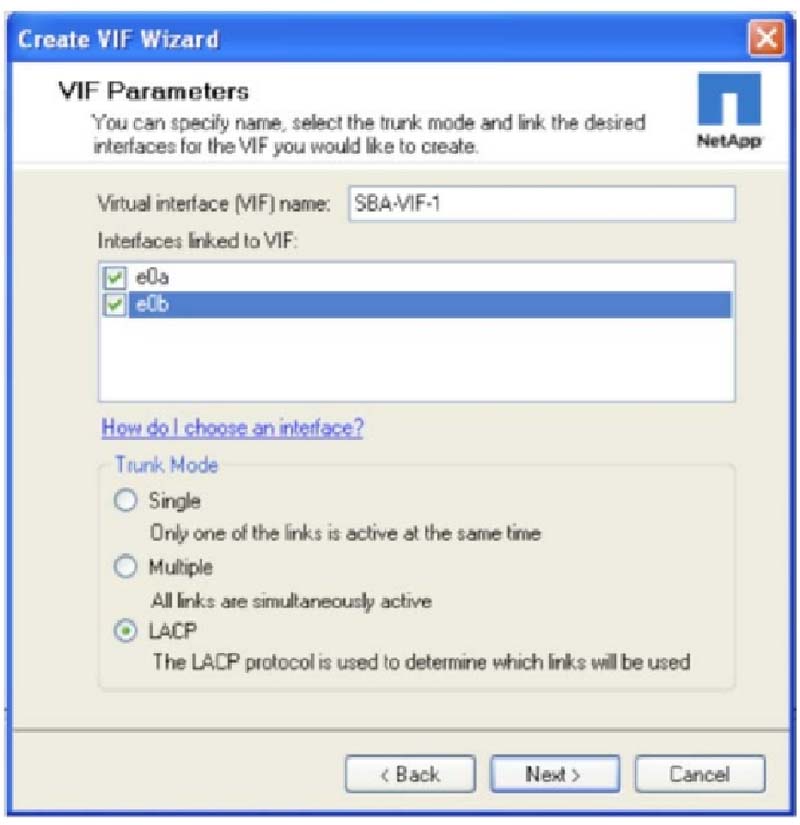 Система хранения NetApp может подключаться к сети Ethernet, используя так называемый virtual interface, или VIF (в Data ONTAP 8.x — interface groups, или ifgrp). Конфигурирование VIF из двух интерфейсов обеспечивает устойчивость и надежность, а когда они сконфигурированы в port- channel с использованием Link Aggregation Control Protocol (LACP), оба линка активны и могут использоваться для передачи трафика системы хранения, что, потенциально, может повысить производительность системы. 1. Для создания интерфейса Ethernet как VIF, в экране Network Interfaces выберите Create VIF. 2. Выберите два интерфейса, которые будут частью VIF, и выберите LACP в качестве trunk mode подключения к коммутатору Ethernet, сконфигурированному для использования LACP port- channel. Нажмите Next.