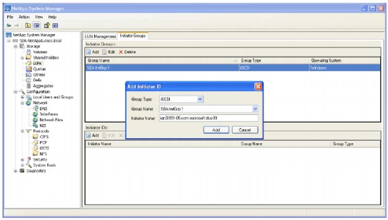 6. Когда группа создана, выделите имя группы в верхней половине правой панели, и щелкните Add для добавления initiator ID группе. Имя инициатора должно соответствовать имени, определенном в конфигурации iSCSI на хост-машине, которая будет получать доступ к хранилищу.