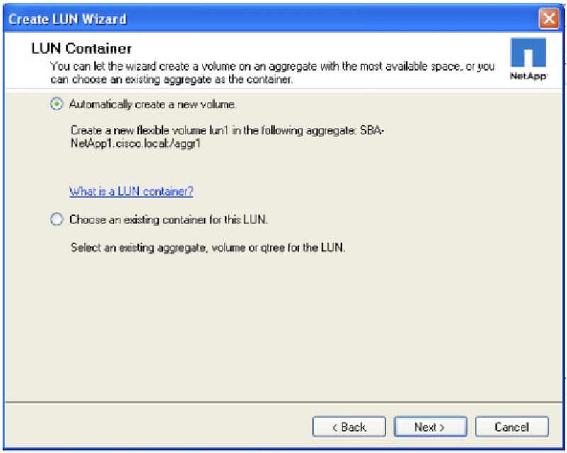 4. Выберите, хотите ли вы автоматически создать новый том или использовать уже существующий. Если вы создали отдельный том перед созданием LUN, то будет доступна опция выбора существующего тома (Choose an existing container for this LUN) .