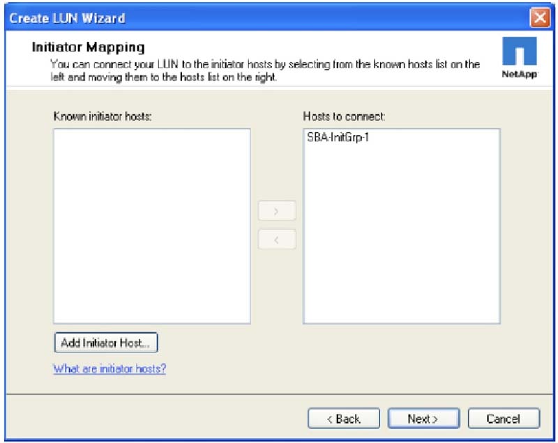 5. Для назначения соответствия («маппинга») LUN и ранее созданной initiator group используйте окно Initiator Mapping. Выберите имя группы в левой половине окна и щелкните стрелку вправо, чтобы переместить выбранное имя в список Hosts to connect. Нажмите Next.