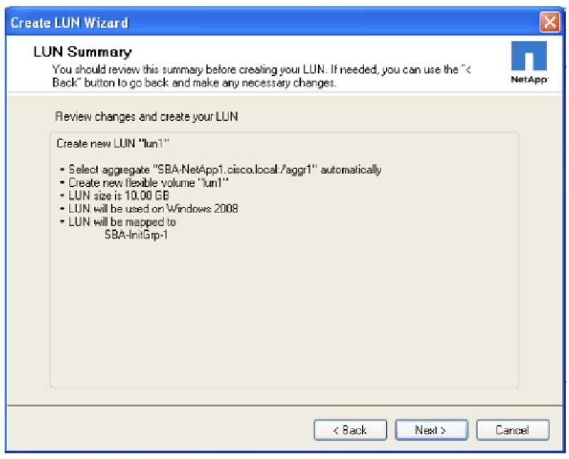 6. Проверьте все выбранные настройки, применяемые к системе, приведенные в окне LUN Summary. Щелкните Next в окне LUN Summary для выполнения процесса создания LUN.