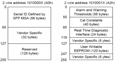 Как представлено на изображении выше, внутренняя память SFP/SFP+ трансиверов SNR имеет 2 таблицы A0 и A2. Кроме того принято делить таблицы на подтаблицы. Таблицу A0 с 0 по 127 байт называется A0 Нижняя (low), с 128 по 255 - A0 Верхняя (high). Таблица A2 с 0 по 127 байт называется A2 Нижняя (low), с 128 по 255 - A2 Верхняя (high).