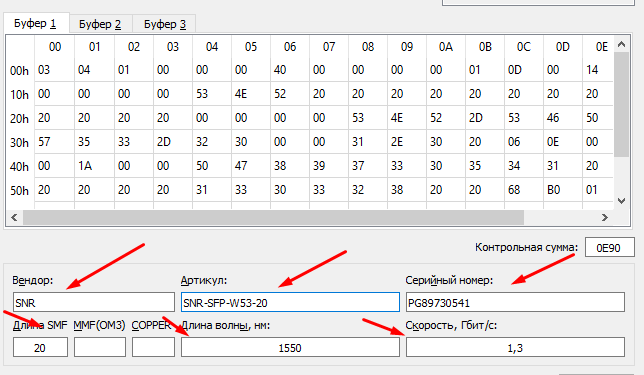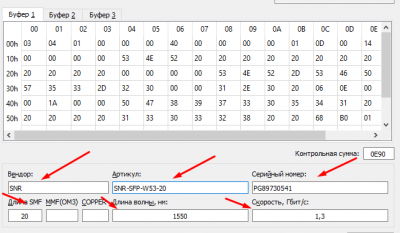 В интерфейсе программы SNR SFPWriter имеется возможность изменения информационных параметров в прошивке модуля. Для этого после чтения прошивки с модуля, укажите необходимые значения в одном из полей: