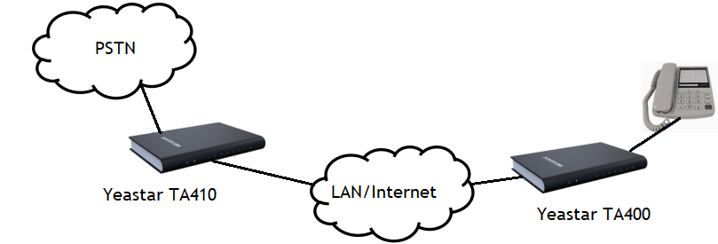 Нередко возникает задача удлинения аналоговых линий: необходимо подключить аналоговые абонентские телефоны в удаленном офисе В к аналоговой телефонии в головном офисе А. В этом случае необходимо использовать шлюзы FXO-FXS, которые поддерживают трансляцию звонков по IP. Ниже рассмотрена реализация подобной схеме на примере VoIP оборудования Yeastar: FXS-шлюз Yeastar TA400 и FXO шлюз Yeastar TA410.