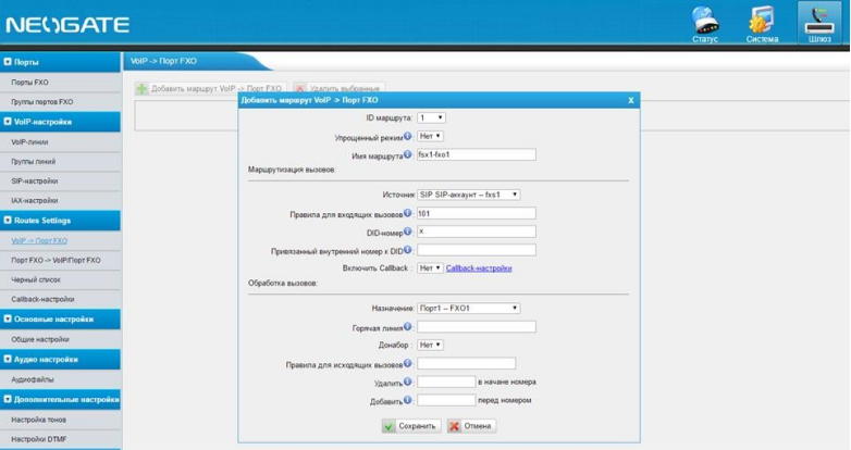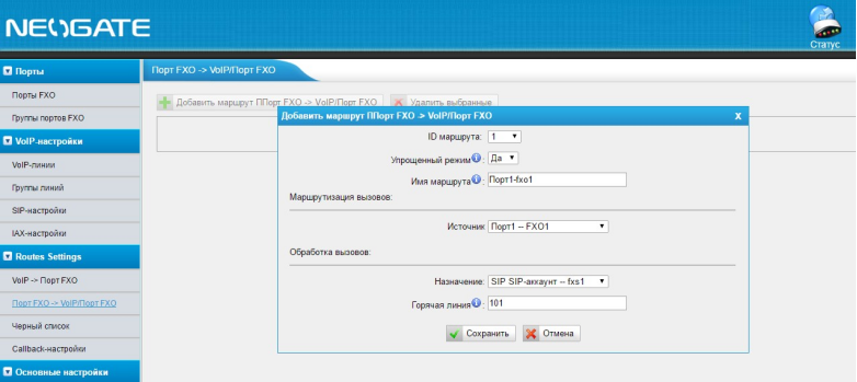 Нажмите на кнопку "Добавить маршрут VoIP -> Порт FXO"