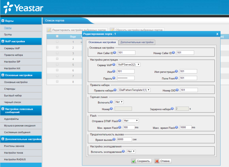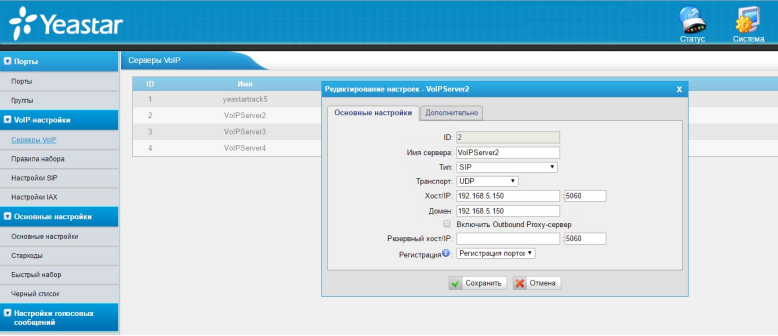 В поле "Сервер VoIP" выбирается сервер, который настраивался в разделе "Серверы VoIP" для связи со шлюзом Yeastar TA410