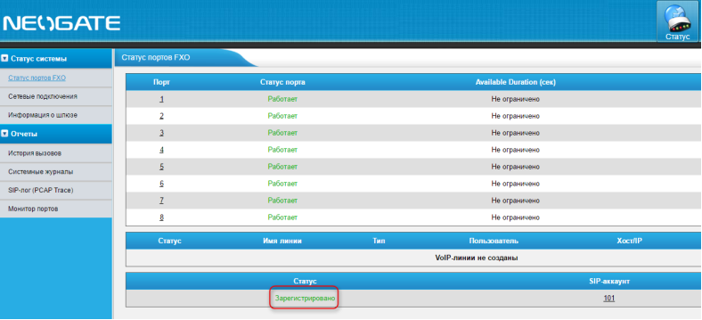 После сохранения и применения указанных настроек, вы можете проверить регистрацию SIP-аккаунта в разделе "Статус" шлюза Yeastar TA410