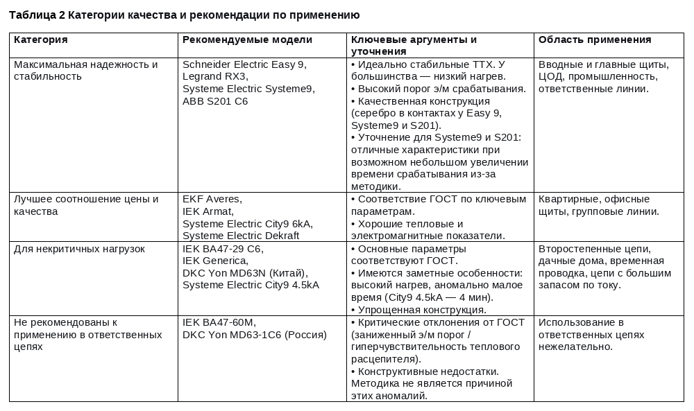 Если для вашего проекта критично точное соответствие времени срабатывания при 1,45·Iном, к результатам для моделей, показавших время, близкое к 60 минутам (например, Systeme Electric Systeme9, ABB S201), следует относиться с осторожностью. Рекомендуется их дополнительная проверка или выбор моделей с большим запасом (Easy 9, RX3, Averes), чьи результаты однозначно укладываются в норму даже при слегка заниженном токе.