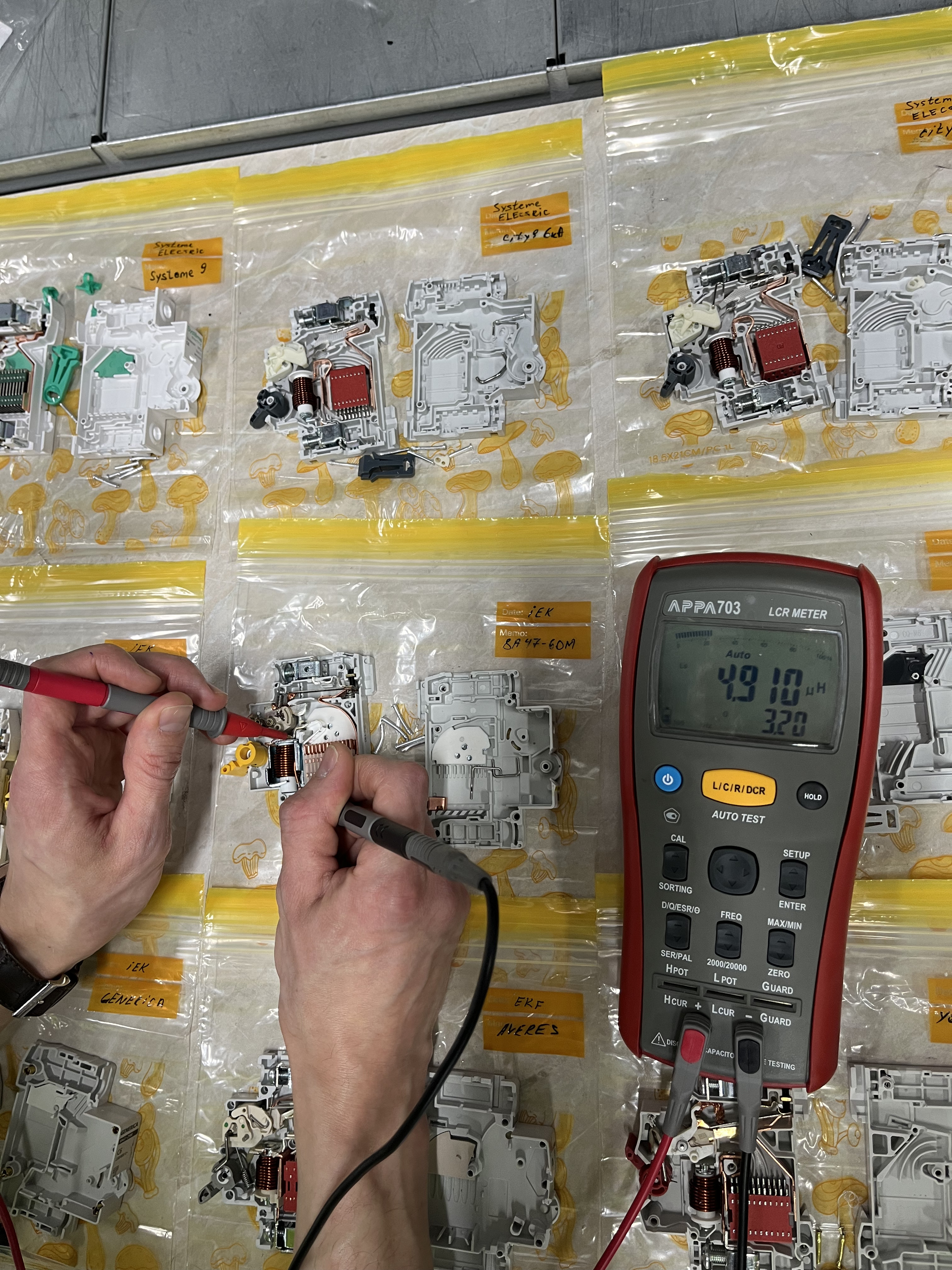Образец продемонстрировал самую высокую индуктивность (9,9 мкГн) и самый низкий измеренный ток срабатывания (27,5 А). Это прямо указывает на конструктивную причину брака: аномально большое число витков катушки. Для создания необходимой для срабатывания магнитодвижущей силы (МДС) при большом количестве витков (N) требуется меньший ток (I = МДС / N). Некорректная калибровка или брак пружины усугубили эту ситуацию, приведя к выходу за нижнюю границу стандарта.