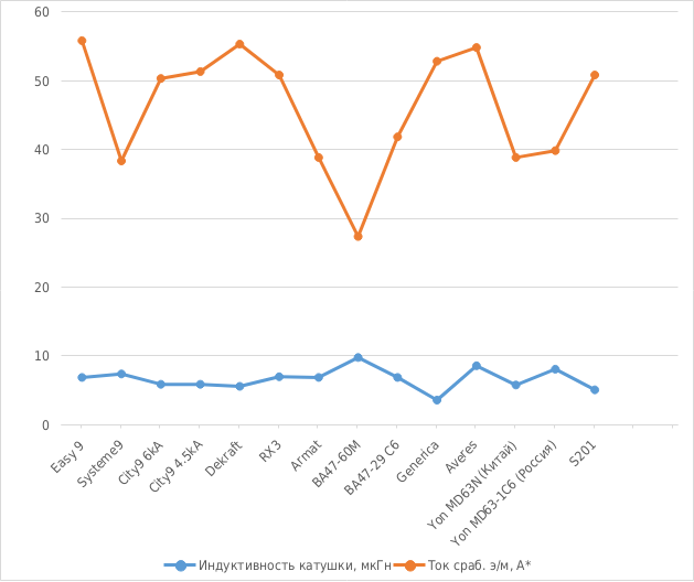 Например, модели с близкими значениями индуктивности (~7,0 мкГн) демонстрируют разный ток срабатывания: Schneider Easy 9 — 56,0 А, а IEK Armat — 39,0 А. Это различие, вероятно, обусловлено более тугой пружиной в первом случае.