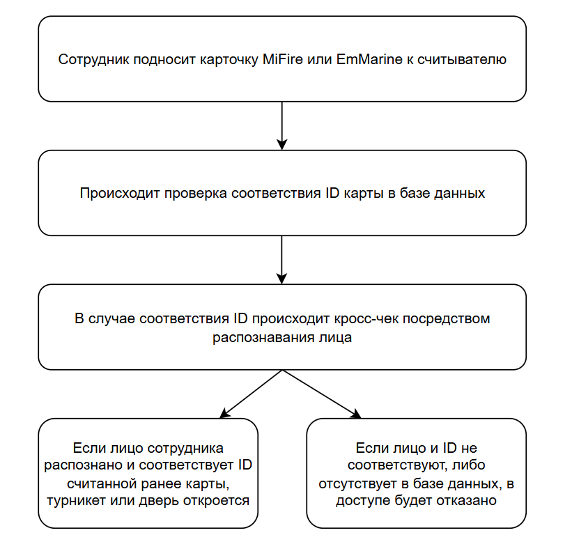 Кроме того, комплекс из СКУД и распознавания лиц позволяет реализовать 100% контроль за учетом рабочего времени сотрудника, а также, быть уверенным, что по его пропуску не отмечается коллега или случайный человек.