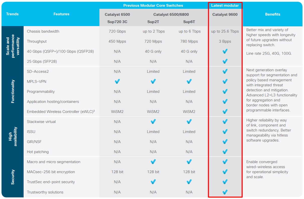 Коммутаторы Cisco Catalyst C9600 — это флагман 9000 серии современных коммутаторов Cisco Catalyst. Применяется в качестве модульной платформы для уровней ядра и агрегации сети крупных предпиятий и операторов связи. Обеспечивает высочайшую общую производительность - до 25.6Tбит/с и максимальную плотность портов 10/25/40/100G.