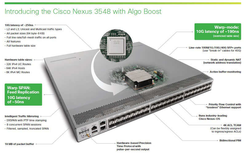 Коммутатор Cisco Nexus 3548 работающий в режиме "warp" обладает ультранизкой задержкой (от 250 до 190 наносекунд) в среде с малыми и средними требованиями к масштабированию Layer 2 и Layer 3. Кроме того, этот коммутатор облегчает эффективную доставку биржевых данных на финансовые торговые серверы: с помощью функции warp SPAN данные доставляются всего за 50 наносекунд.