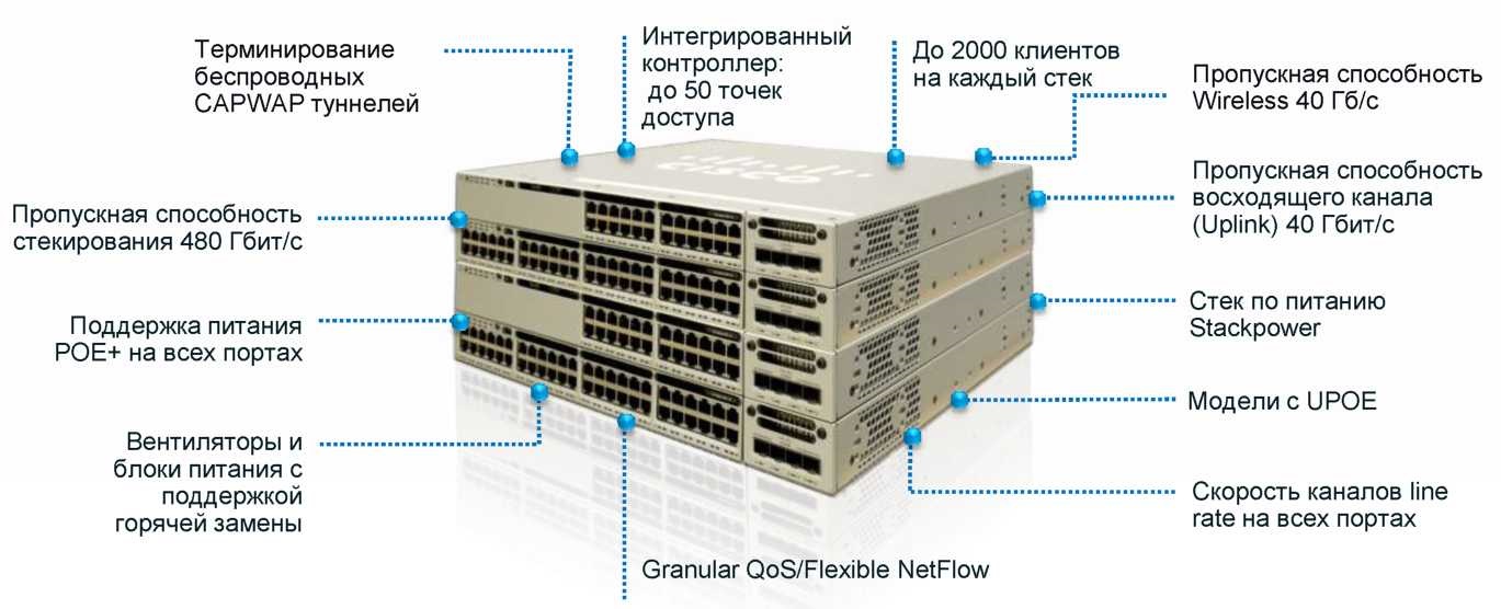 Коммутаторы Catalyst 3850 серии - это стекируемые коммутаторы доступа следующего поколения для корпоративного сектора, которые обеспечивают конвергенцию проводных и беспроводных сетей.