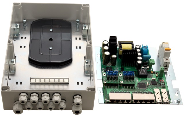 10-портовый коммутатор PSW-2G8F+ представляет собой всепогодный (IP66) компактный бокс (240х360х120 мм), изготовленный из прочного высококачественного пластика. Внутри блока установлена плата коммутатора, блок питания, оптический кросс. Монтажная панель имеет вырез в виде din-рейки для установки одного автомата.