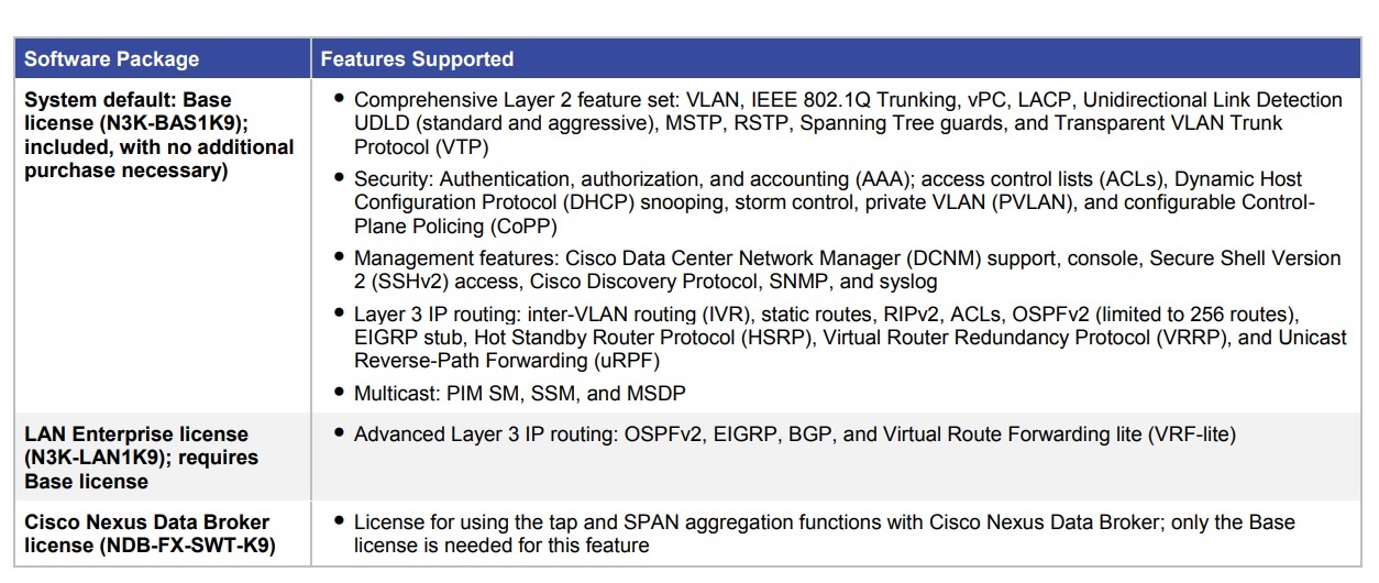 - Содержит функционал Layer 3 Enterprise Services Package (лицензия N3K-LAN1K9), в том числе Layer 3 Base Services Package (N3K-BAS1K9) Описание функционала