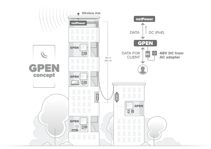 GPEN21 имеет порт Ethernet и SFP для оптоволоконного подключения. Клиенты могут использовать GPEN21 для питания оптического модуля для канала связи с провайдером или для обеспечения PoE для питания восходящего канала Ethernet к провайдеру, Блок GPEN Имеет настенное исполнение. Кабель Ethernet можно проложить либо непосредственно через его нижнее отверстие для кабеля, либо в стену.