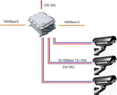 Степень защиты от пыли и влаги - IP67, рабочий диапазон температур от -55°С до +40°С. Это позволяет использовать взрывозащищенный коммутатор как в помещениях, так и в уличных условиях.