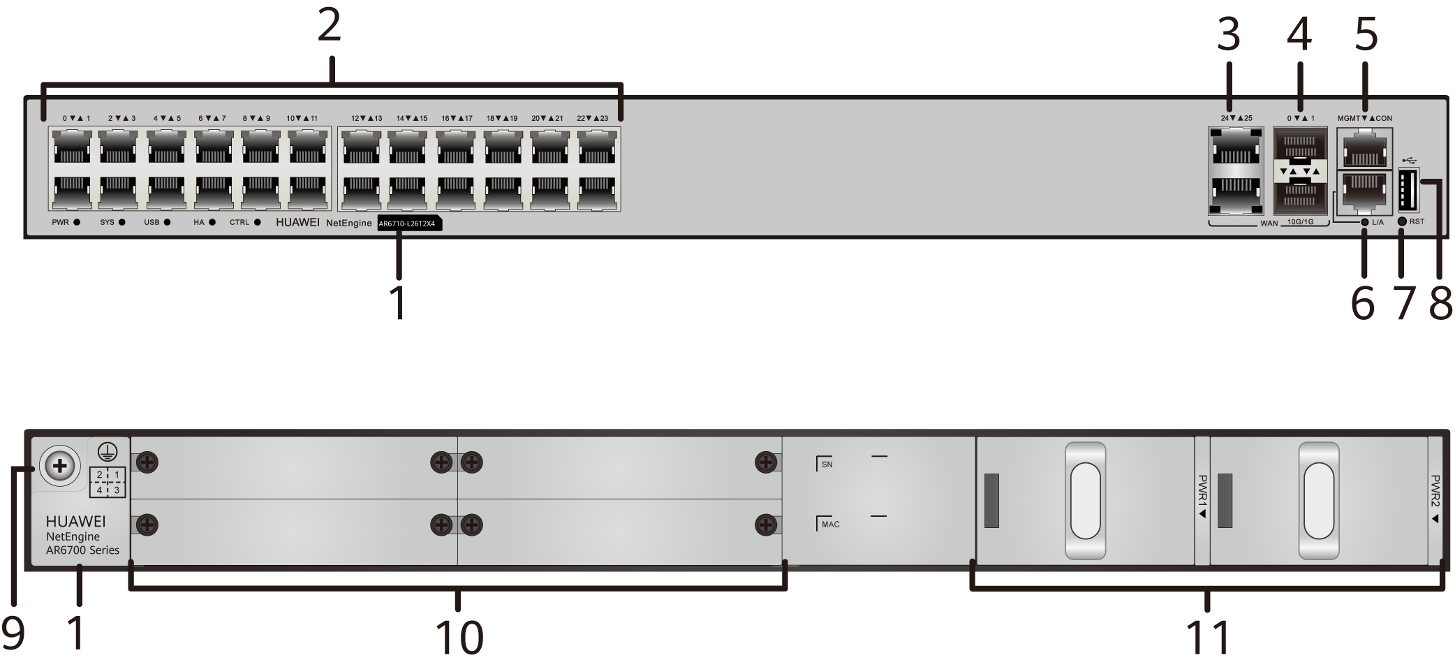 | 3. Интерфейсы WAN: два электрических интерфейса GE (GE24 - GE25) | 4.Два оптических интерфейса 10 GE (10GE0 - 10GE1) |