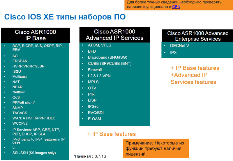 Маршрутизаторы используют новое ПО Cisco IOS XE (устанавливается на Cisco ASR 1000 в качестве модульной ОС). Это ПО разработано на базе Cisco IOS 12.2SR и обеспечивает высокую надежность, скорость и возможность модульной компоновки. Высочайшая гибкость и производительность встроенного процессора Cisco ASR 1000 обеспечивает безопасность сети, оптимизацию сетевого трафика, поддержку Cisco IOS Firewall и другие дополнительные функции Cisco IOS XE без необходимости подключения дополнительного оборудования.