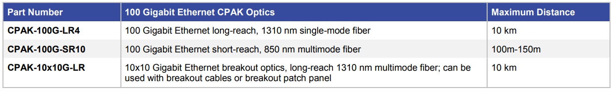 Например, с помощью оптики Cisco CPAK 10x10G-LR один 100-гигабитный порт может быть разделен с помощью breakout кабеля или патч панели на 10 портов по 10 Гбит/с каждый.