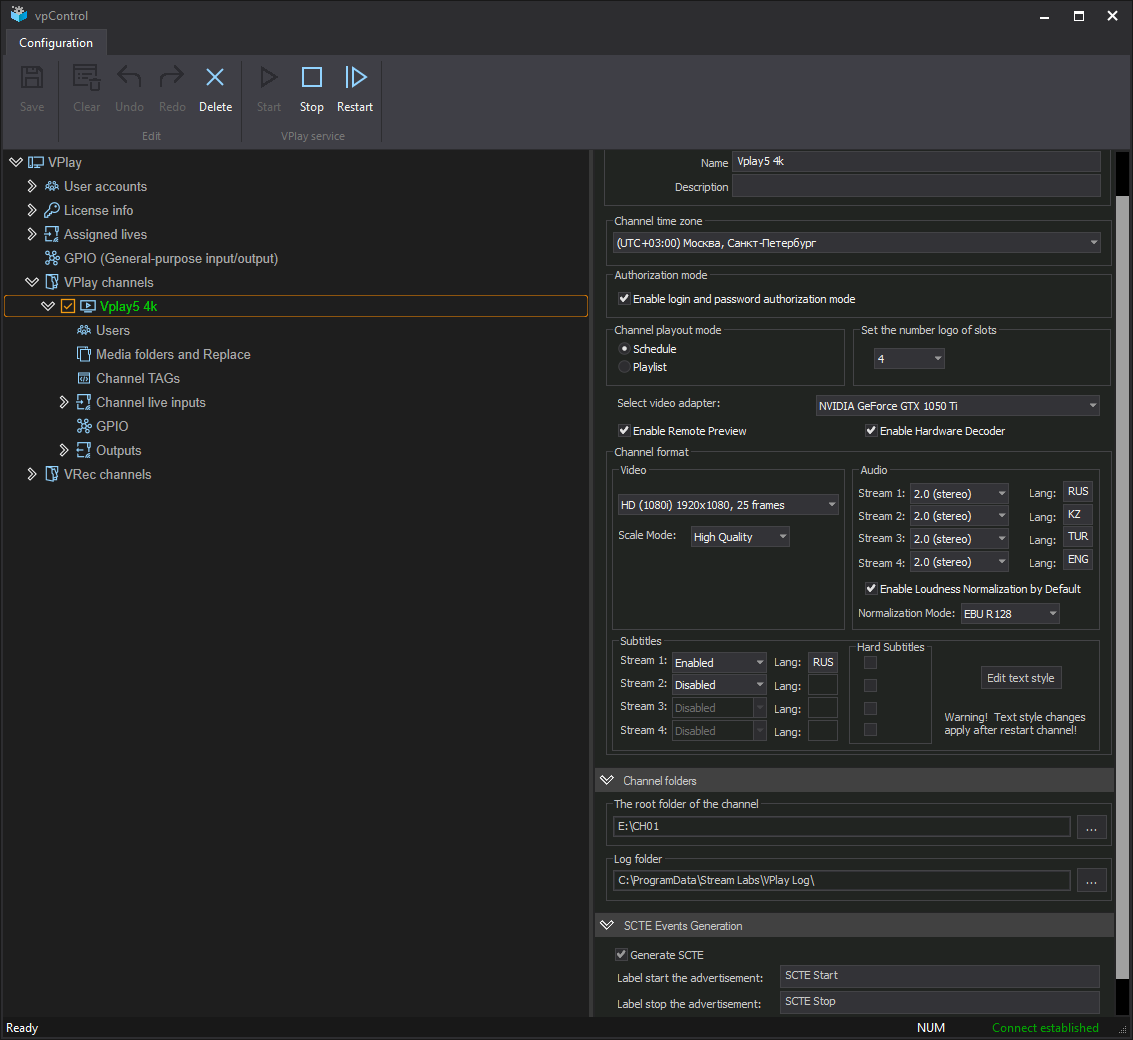 Программа VPlay Control устанавливается на сервере и служит для конфигурации серверов VPlay. При помощи VPlay Control выполняется настройка каналов вещания, принимаемых и выходных сигналов, распределение входных сигналов на один или несколько выходных каналов.