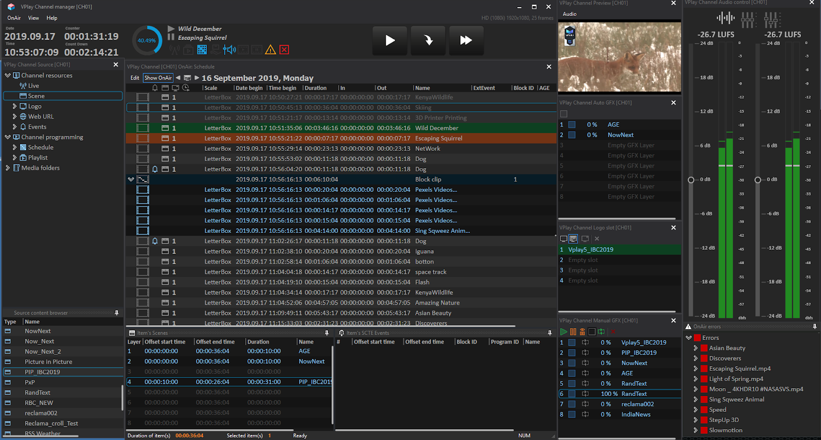 Расписание оперативно редактируется в процессе воспроизведения. Расписание состоит из источников любого типа: входов «живого» видео, клипов, графических сцен, динамических логотипов, ссылок на видеоисточники в Интернет.