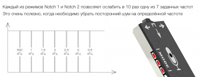 Ширина полосы подавления составляет 200 или 550Гц, в зависимости от выбранной частоты.