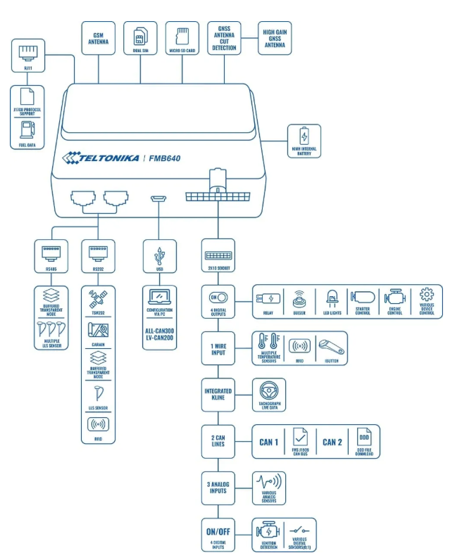 Teltonika FMB640 - это GNSS и GSM терминал для промышленных приложений. FMB640 предназначен для комплексных решений, где одно устройство может выполнять несколько задач.