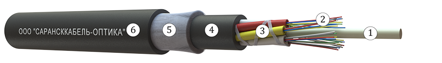 Свободное пространство внутри оптических модулей и межмодульное пространство заполнено гидрофобным гелем. Сердечник скреплен нитями. На сердечник наложена ПЭТ лента, закрепленная нитью. Поверх скрутки наложена промежуточная оболочка из полиэтилена. На промежуточную оболочку наложен армирующий повив из стеклонитей. Защитная оболочка – полиэтилен высокой плотности.