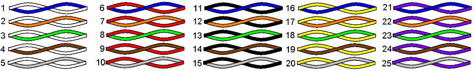 При разделке многопарных кабелей рекомендуется следовать универсальному цветовому коду, где пары маркируются двумя цветами: основным и дополнительным. Основные цвета – белый, красный, черный, желтый и фиолетовый (что бы было легче запомнить - Буратино Красил Чердак Желтым Фломастером), дополнительные – синий, оранжевый, зеленый, коричневый и серый (все в приведенном порядке). При этом первой монтируется проводник основного цвета, а второй — дополнительного. В итоге, регламентируется последовательность для 25 пар или для 50 проводников. Порядок следования пар в соответствии с цветовой кодировкой показан на рисунке.