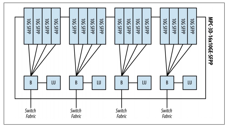 Данная карта содержит 4 комплекса коммутации Trio, каждый из которых способен работать на скорости до 40Гбит/с в режиме полного дуплекса. В шасси МХ240/480 каждый комплекс коммутации соединен с фабрикой коммутации 8 каналами, скорость работы каждого канала примерно 6,25 гбит/с. Итого: пропускная способность шины между картой и фабрикой составляет 50 гбит/с, что позволяет работать в режиме полной загрузки всем 4 портам. В шасси МХ960 каждый комплекс коммутации соединен с фабрикой коммутации только 6 каналами, что позволяет обеспечить работу на максимальной скорости только 3 портам.