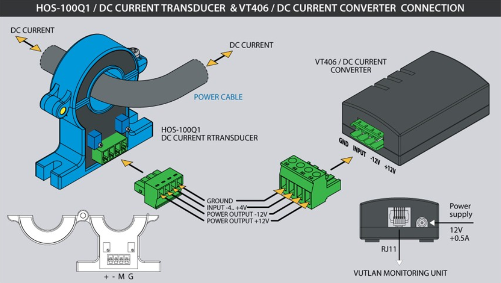 Датчик тока Холла используется для измерения постоянного тока. Интерфейс системы позволяет назначить датчик и ввести функцию преобразования данных. Преобразователь постоянного тока VT406 может использоваться вместе с HOS-100Q1 для преобразования данных в формат системы удаленного мониторинга.