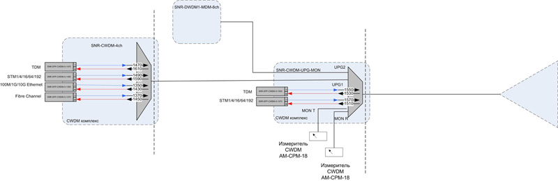 Пассивное устройство спектрального мультиплексирования-демультиплексирования для 8-х оптических каналов, работающее по одному волокну. Исполнение в виде 1/2U-слота позволяет совместно с шасси SNR-MDM-CHASSIS более рационально использовать занимаемое пространство. Комплектуется двумя UPG портами. Один UPG порт позволяет включать данный мультиплексор в существующую линию в качестве OADM, второй порт соединенный с DWDM мултиплексором позволяет пропустить дополнительно до 8 DWDM каналов. Монитор порты "Mon T" и "Mon R" отводят 5% сигнала на прием и передачу, что позволяет померять уровень сигнала не прерывая передачу.