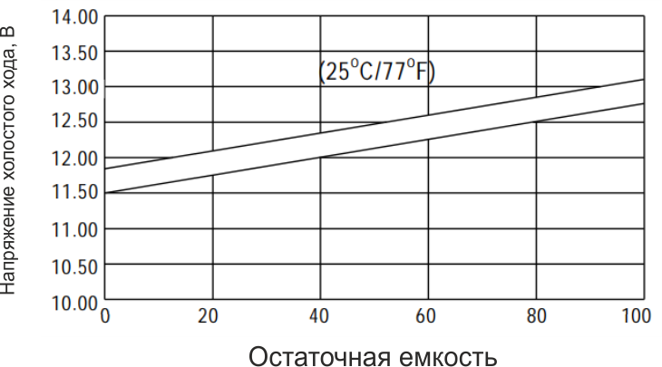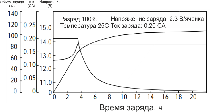 | Отношения напряжения холостого хода и емкости (25°C) | Характеристики зарядки (25°C) | |