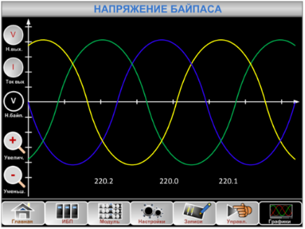 Пользователь может просмотреть графики выходного напряжения, тока и напряжение байпаса коснувшись соответствующих иконок на левой стороне страницы. Графики можно масштабировать.
