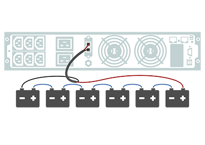 Источник бесперебойного питания SNR-UPS-ONRM-3000-X72 без встроенных АКБ, поэтому для обеспечения автономной работы необходимо подключить 6 аккумуляторов последовательно, так как изображено на рисунке.