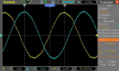 Осциллограмма электрического сигнал на входе и выходе ИБП (желтый - на входе в ИБП, синий на выходе ИБП)