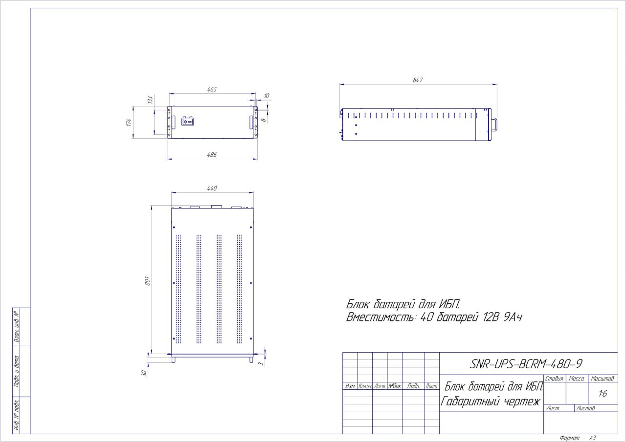 Корпус блока батарей (арт. SNR-UPS-BCRM-480-9) предназначен для сборки блока батарей, применяется совместно с трехфазными ИБП SNR серий CM (10-45кВА) и INTELLIGENT (15-40кВА) с напряжением на DC-шине -480В и обеспечивает автономную работу подключенного к ИБП оборудования. Батарейный блок имеет Имеет высоту 4U и устанавливается в телекоммуникационнуюстойку или шкаф 19’’ на усиленную стационарную полку для шкафов (приобретается отдельно), в непосредственной близости от ИБП.