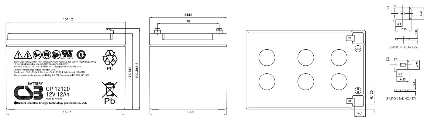 В аккумуляторной батарее для электродов применен специализированный устойчивый сплав свинца и кальция. Это способствует повышенной выходной мощности и минимальному саморазряду. Продукция герметизированна, способна работать в цикличном или буферном режиме, часто используется в источниках бесперебойного питания. AGM технология защищает от быстрой деградации электродов, сохраняя высокую эффективность электрохимических реакций. F1/F2 клеммы обеспечивают простое подключение и надежный контакт.